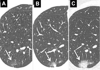 | Evoluția unui nodul pulmonar: A. la depistare; B. CT la 3 luni; C. CT la 6 luni. Sursa foto: Recommendations for the management of subsolid pulmonary nodules detected at CT: a statement from the Fleischner Society. |